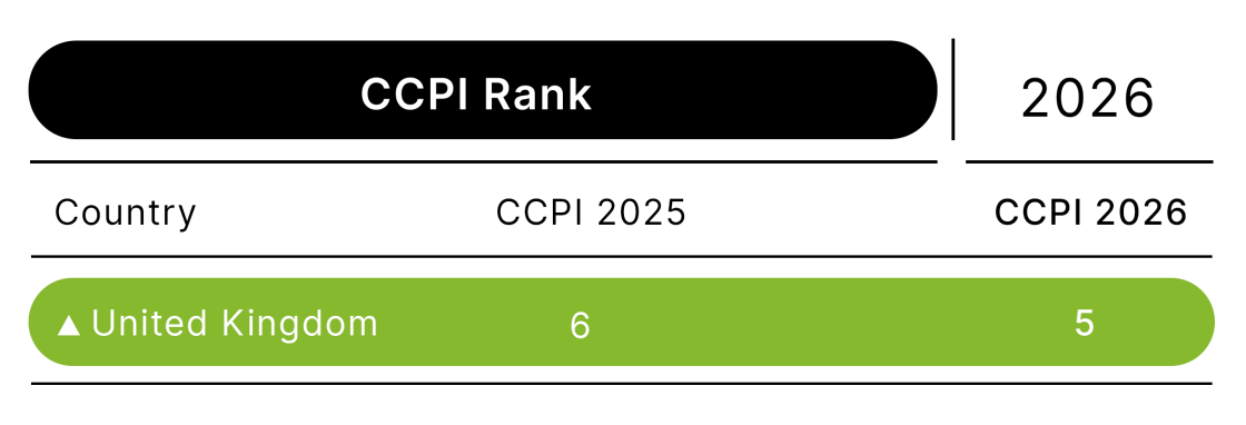 - The United Kingdom ranks 5th in this year’s CCPI, up one spot and remaining among the high performers