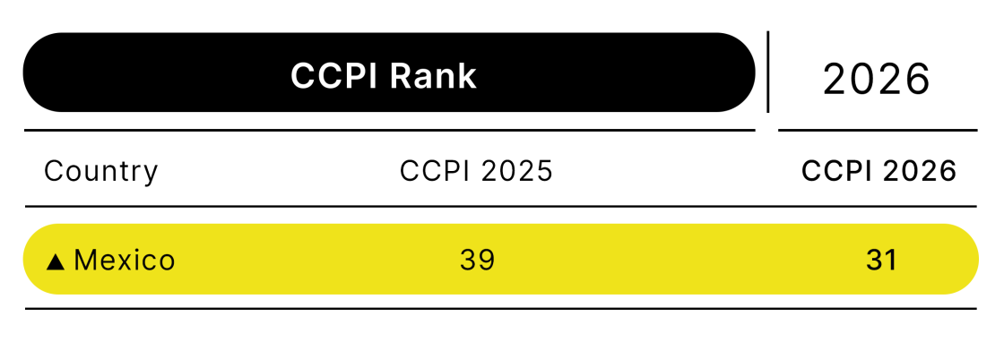 - Mexico rises from a low performer to a medium performer in this year’s CCPI, now 31st