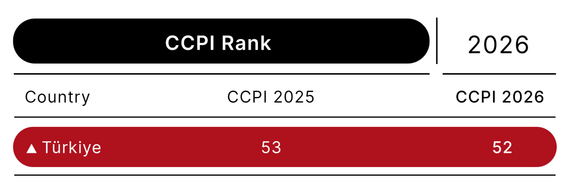 - Türkiye is ranked 52nd in the CCPI – up one spot but remaining among the very low overall performers